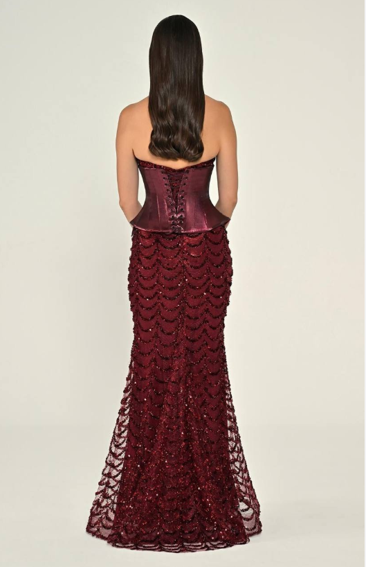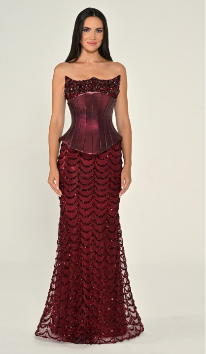 - التصميم: فستان طويل سترابلس بخصر كورسيه مزين بالترتر