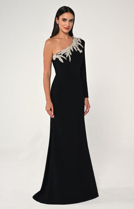 فستان كريب طويل بكم واحد مزين بالأحجار، تصميمه الراقي يبرز أناقة الذراع وينسدل بانسيابية، لإطلالة جذابة ومميزة في كل مناسبة.